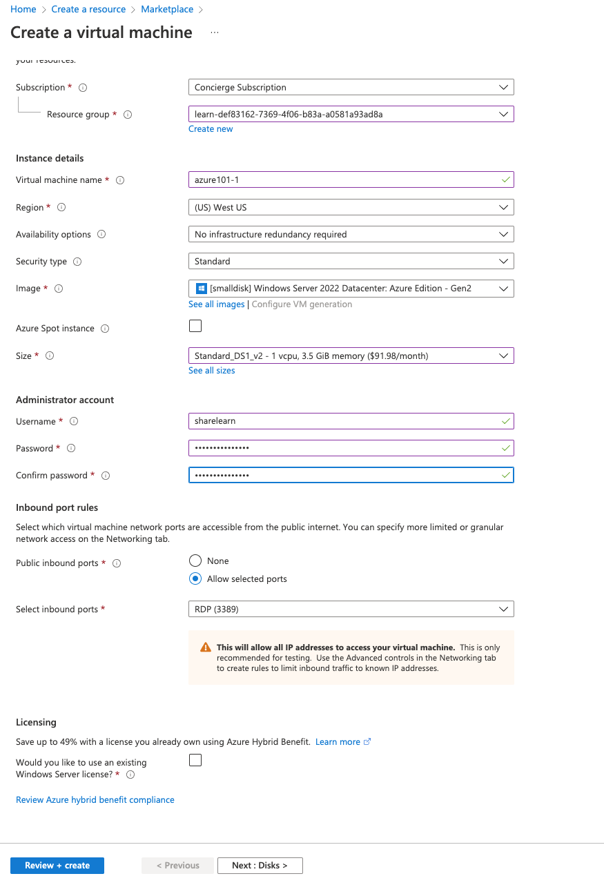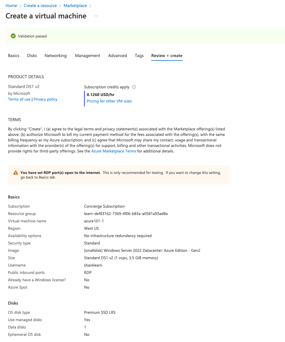 Select Review + create. The system will validate your options and display details about the VM being created.