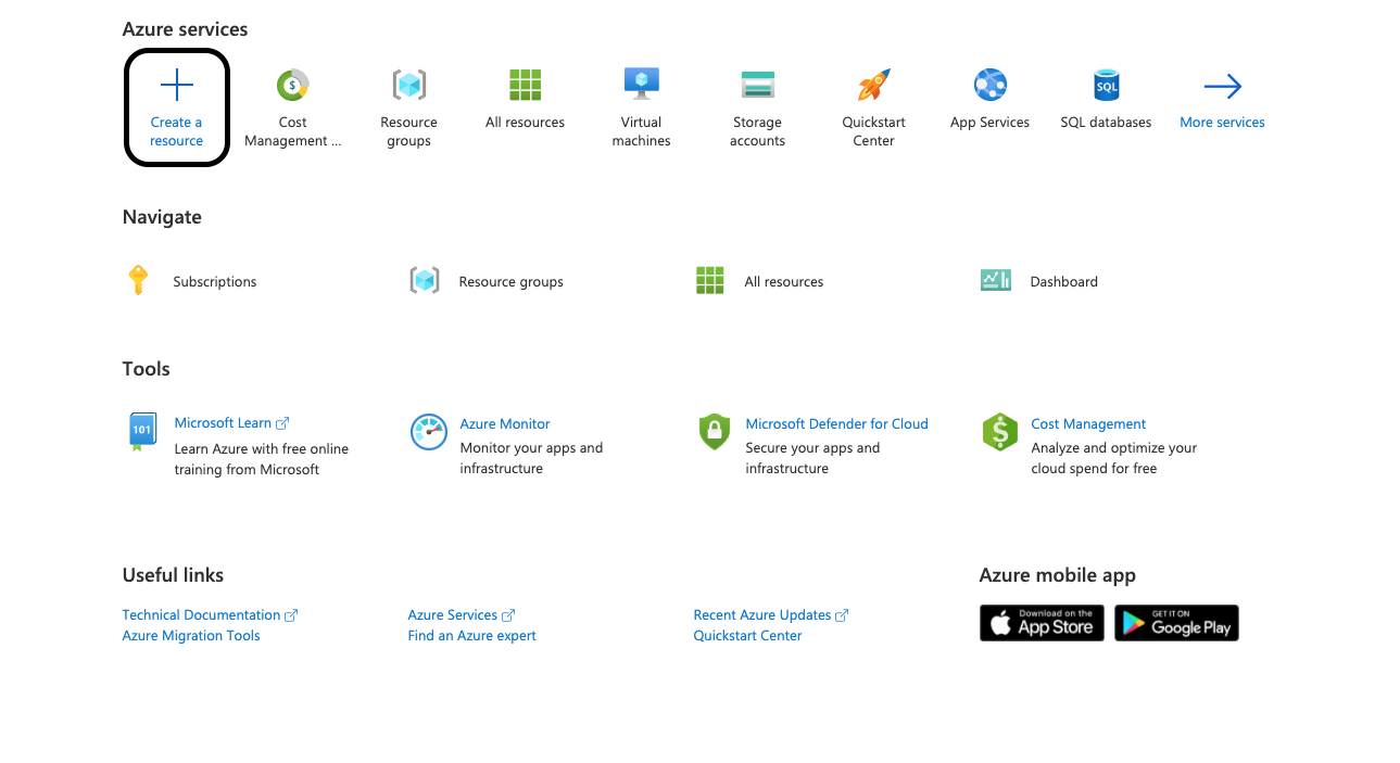 Select Create a resource from the Azure portal’s Azure services section. The pane to create a resource appears.